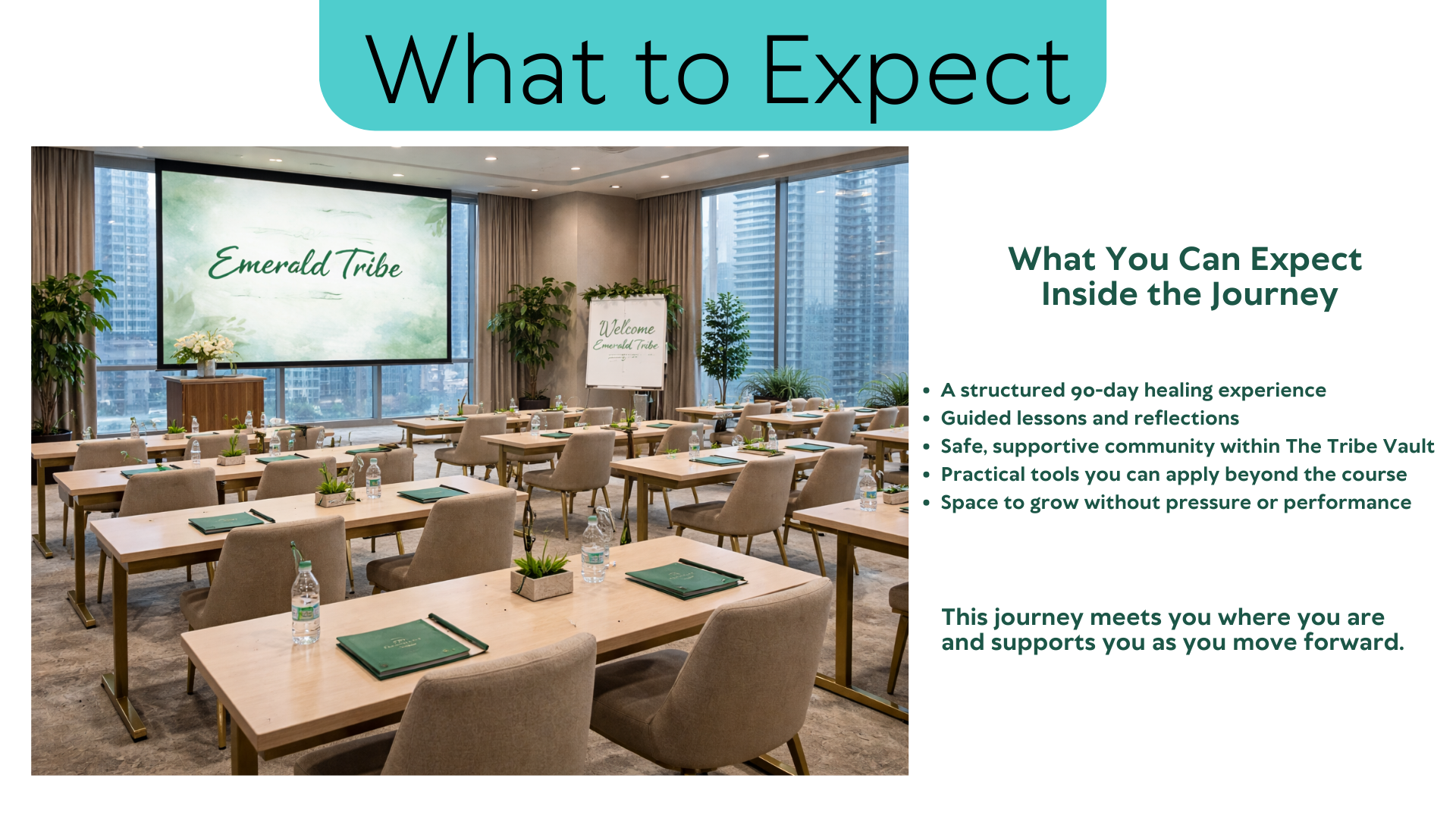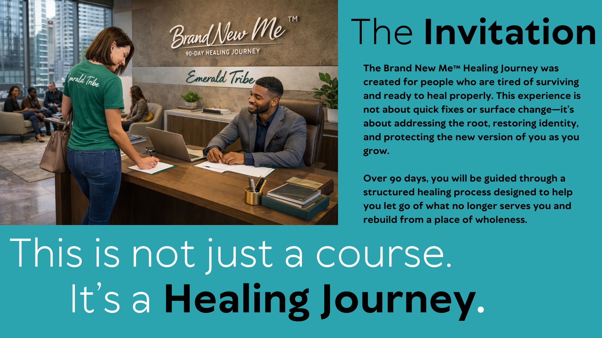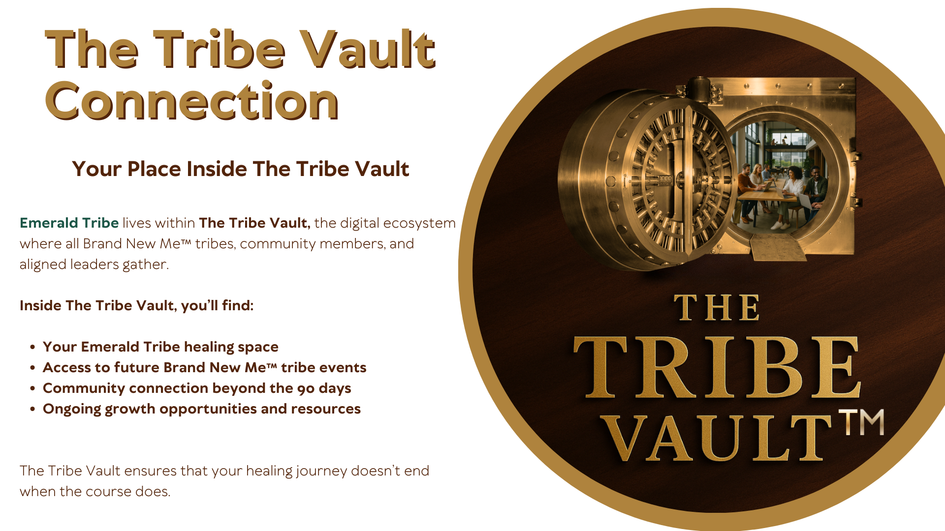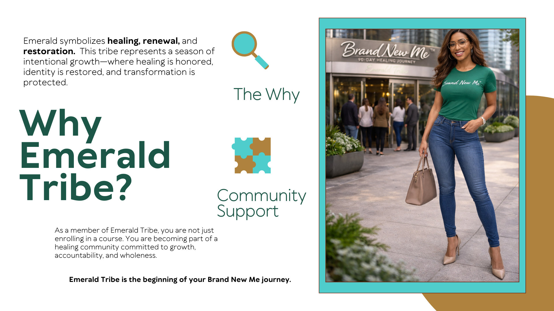 The Emerald Tribe Edition of the Brand New Me™ 90-Day Healing Journey is a guided transformational experience designed to help you heal from the inside out, restore your identity, and move forward with clarity and confidence. This 90-day instructor-led course includes structured weekly guidance, access to the Emerald Tribe community support space inside The Tribe Vault, and full portal access to course materials and replays. At the completion of the journey, students will participate in a formal celebration and receive a Certificate of Completion honoring their commitment to healing and growth.   clarity and confidence. This 90-day instructor-led course includes structured weekly guidance, access to the Emerald Tribe community support space inside The Tribe Vault, and full portal access to course materials and replays. At the completion of the journey, students will participate in a formal celebration and receive a Certificate of Completion honoring their commitment to healing and growth. Investment: $199 Please note: The Brand New Me Healing Journey book (physical or ebook) is required and must be purchased separately.